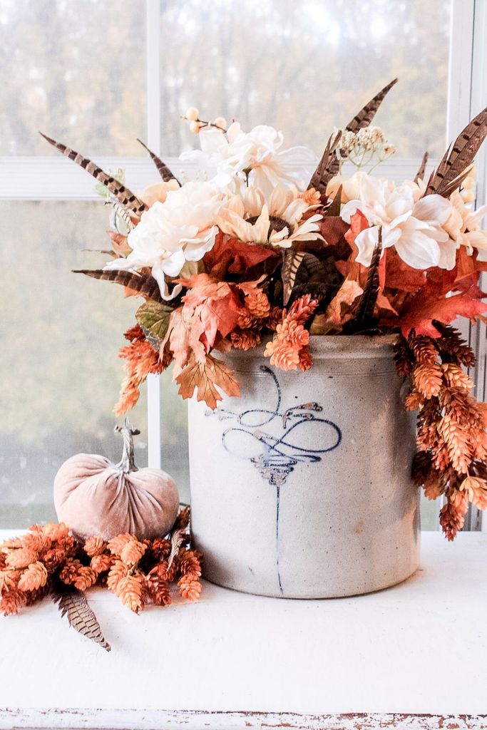 3. Chiếc bình gốm mộc mạc cỡ lớn với những bông hoa giả màu trắng, lá phong đỏ và những cành cây giống hình dáng của quả thông.