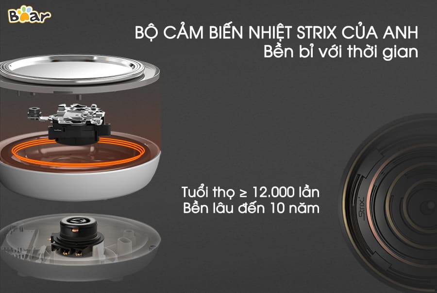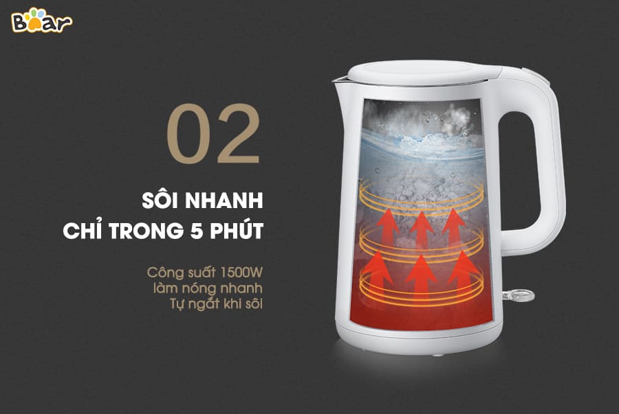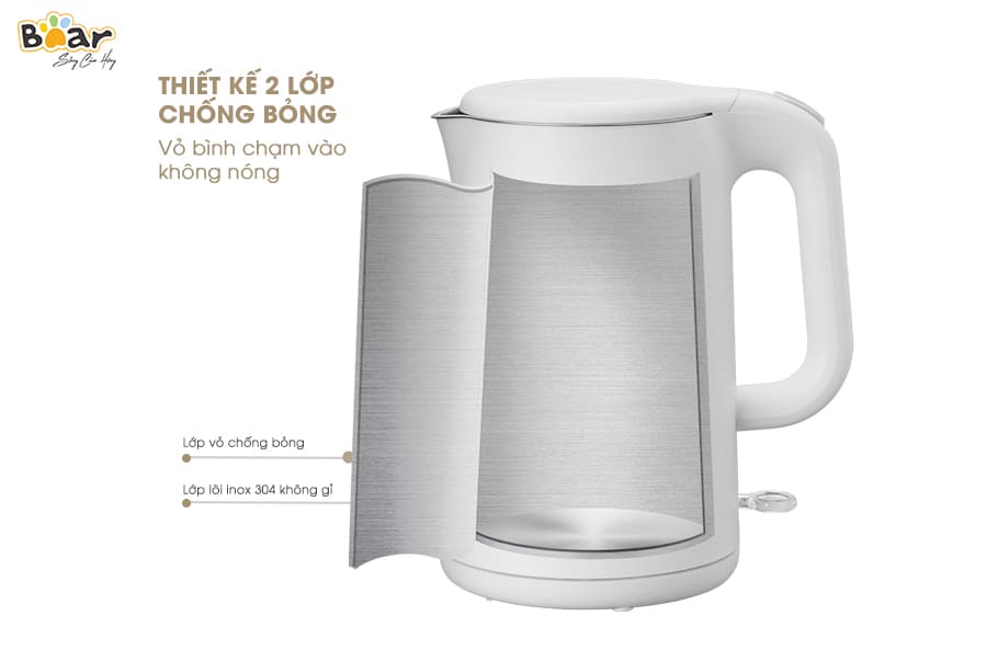 Ấm siêu tốc Bear ZDH-B15T1 có thiết kế 2 lớp: Lớp vỏ sơn tĩnh điện chống bỏng Lớp lõi inox 304 sáng bóng, không gỉ