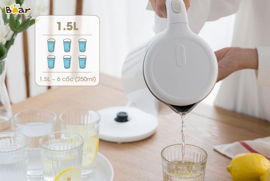 Ấm đun nước siêu tốc Bear ZDH-B15T1 có dung tích 1.5L, rót được 6 cốc 250ml mỗi lần đun sôi. Dung tích này có thể đáp ứng đủ nhu cầu nước nóng hàng ngày cho 3-4 người.