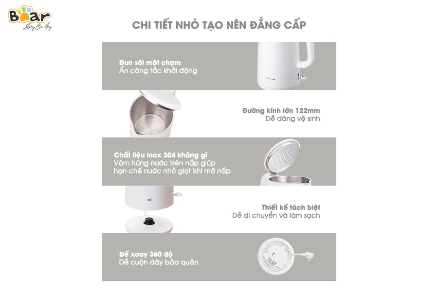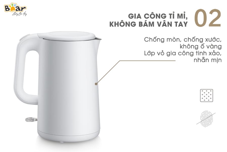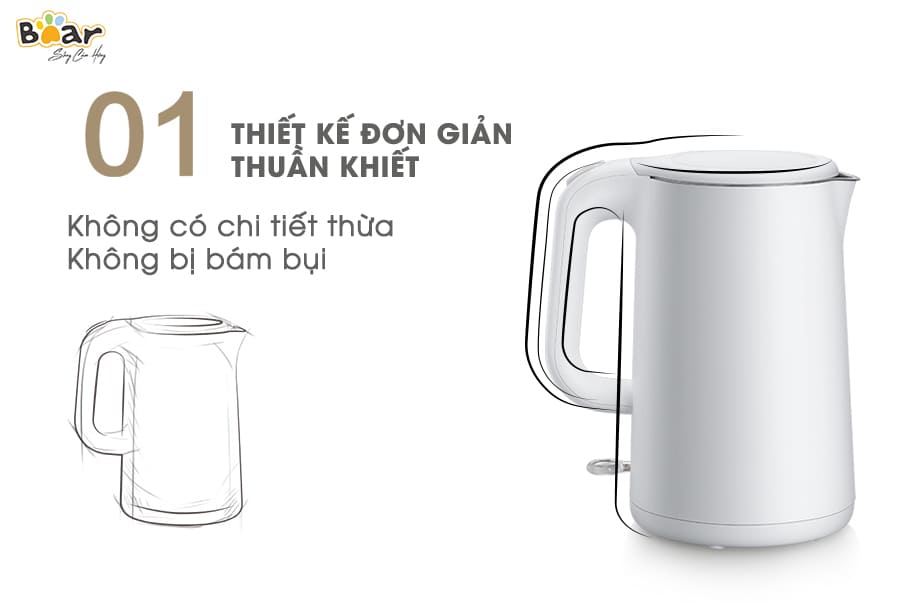 Ấm siêu tốc Bear ZDH-B15T1 được thiết kế liền mạch với các đường nét mịn, không có các chi tiết thừa nên trong thời gian sử dụng sẽ ít bị bám bụi. Ngoài ra, lớp vỏ còn được gia công tỉ mỉ với chất liệu lì nhẵn mịn không bám vân tay, tạo nên vẻ đầy tinh tế.