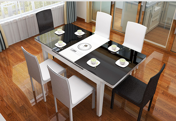 Bàn ăn thông minh tích hợp bếp từ là giải pháp hoàn hảo cho không gian bếp nhỏ. Việc tích hợp bếp từ một mặt rất thuận tiện khi gia đình sử dụng cho những món cần ăn nóng ngay tại bàn như lẩu hay nướng. Với những không gian bếp quá chật có thể sử dụng làm bếp nấu ăn luôn để tiết kiệm diện tích.