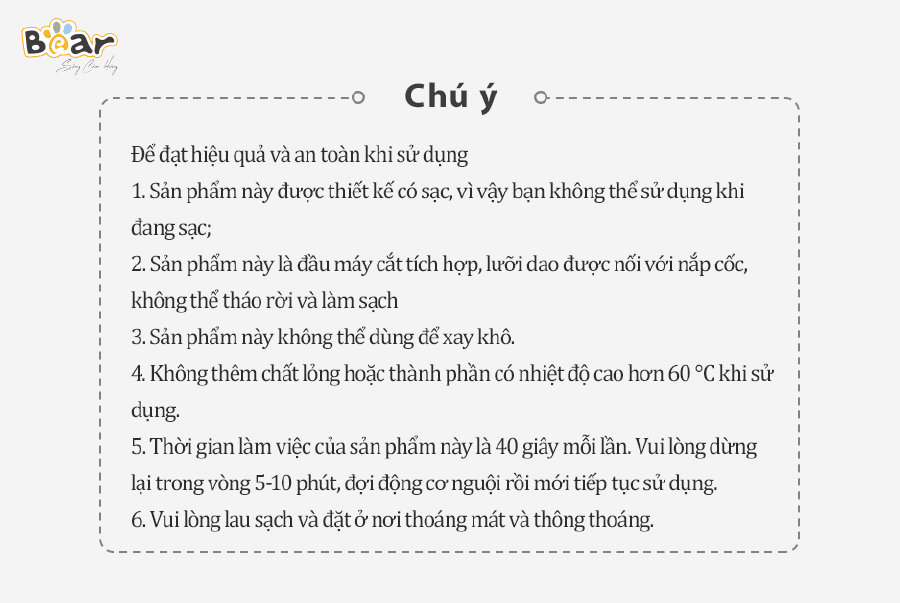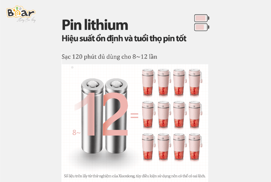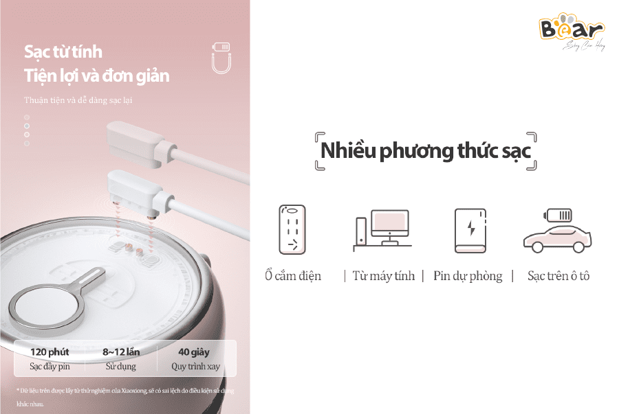 Mỗi lần sạc đầy, cốc xay cầm tay Bear có thể xay được tối đa 8-12 lần tùy theo từng loại thực phẩm. Cốc xay cầm tay Bear có phương thức sạc từ tính hiện đại, rất an toàn khi vệ sinh dù tiếp xúc với nước cũng không bị ảnh hưởng.