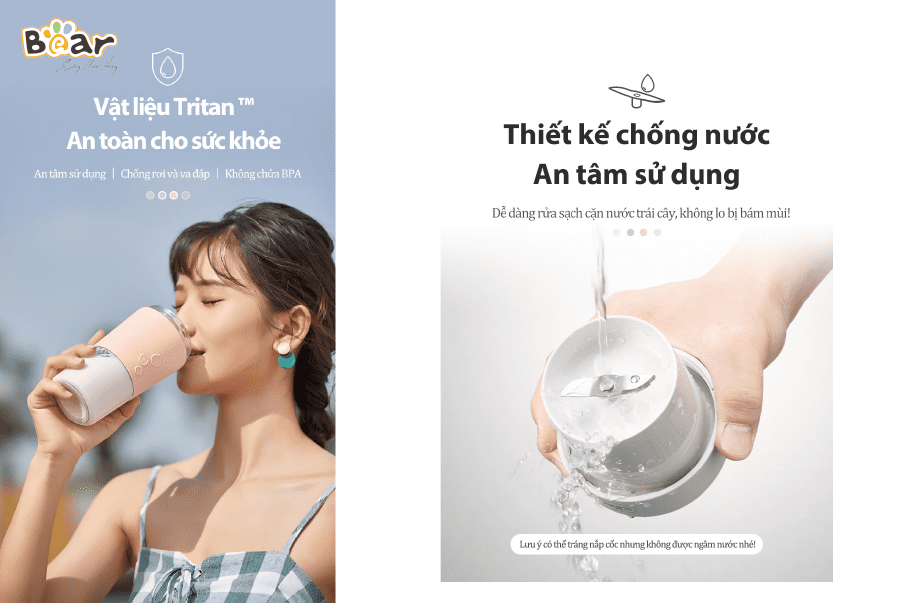 Thân cốc xay làm từ nhựa trian - loại nhựa cứng cáp, an toàn không chứa BPA. Chất liệu này thường được sử dụng khi làm bình sữa hoặc đồ cho mẹ và bé nên an toàn tuyệt đối, chịu được nhiệt dưới 60 độ C.