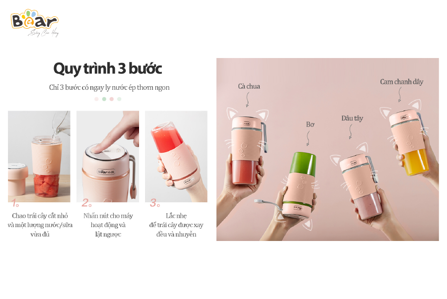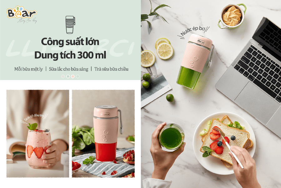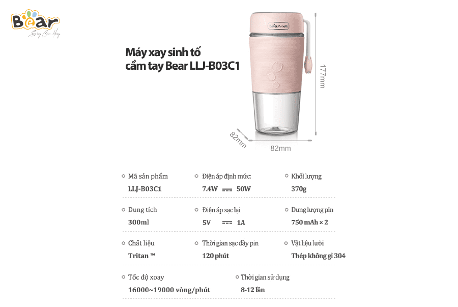 Cốc xay mini cầm tay Bear LLJ-B03C1 có dung tích 300ml, tiện lợi xay sinh tố tươi ngon mọi lúc mà luôn tươi ngon, đáp ứng đủ năng lượng mỗi lần.
