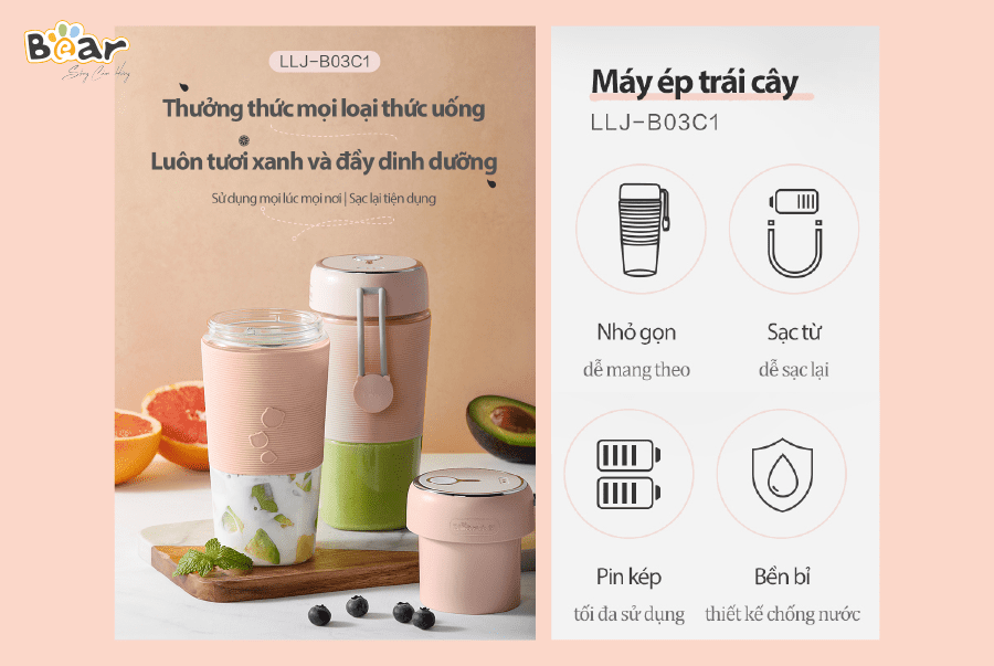 Cốc xay mini cầm tay Bear LLJ-B03C1 có thiết kế thời trang nhỏ gọn, tích hợp công nghệ xay mới với lưỡi dao kép giúp tăng hiệu quả xay. Đặc biệt, cốc xay cầm tay Bear LLJ-B03C1 còn được làm từ chất liệu nhựa ABS có chất lượng tốt an toàn với sức khỏe người dùng, kết hợp với dung tích 300ml và pin dung lượng 700mAh phù hợp với nhu cầu sử dụng cá nhân mọi lúc mọi nơi. Trải nghiệm máy xay cầm tay tại Bear.