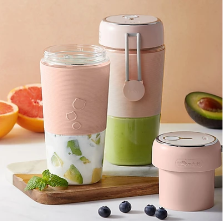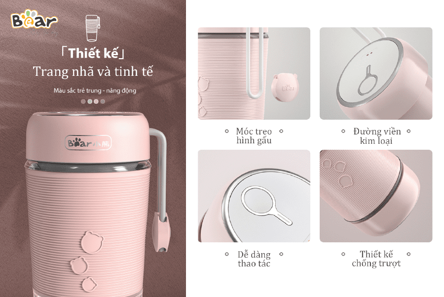 Với thiết kế màu hồng trang nhã phối hợp cùng các đường viền ánh bạc tạo điểm nhấn cho cốc. Đình kèm cốc xay còn có thêm móc treo tiện lợi khi mang đi.