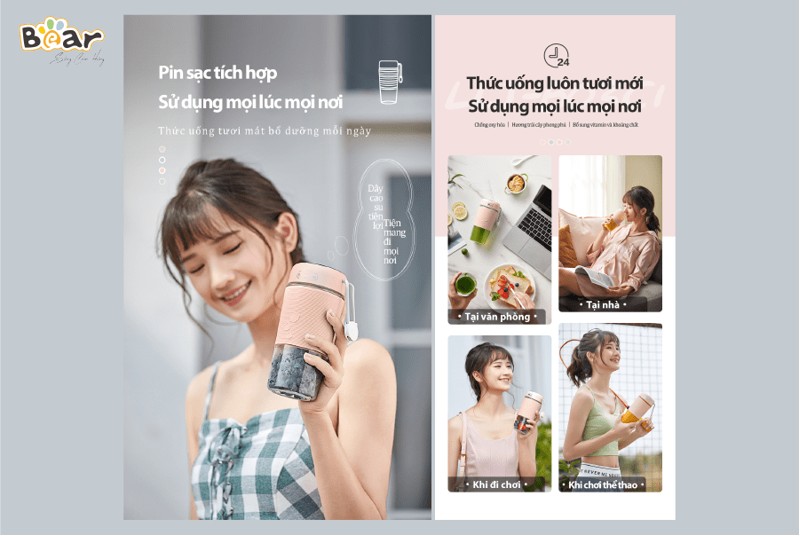 Khác các dòng máy xay thông thường, cốc xay mini cầm tay Bear không cần phải cắm điện trực tiếp để xay mà thay vào đó là pin sạc lithium tích hợp cho phép lấy nguồn điện dự trữ để xay tương tự như sạc dự phòng.