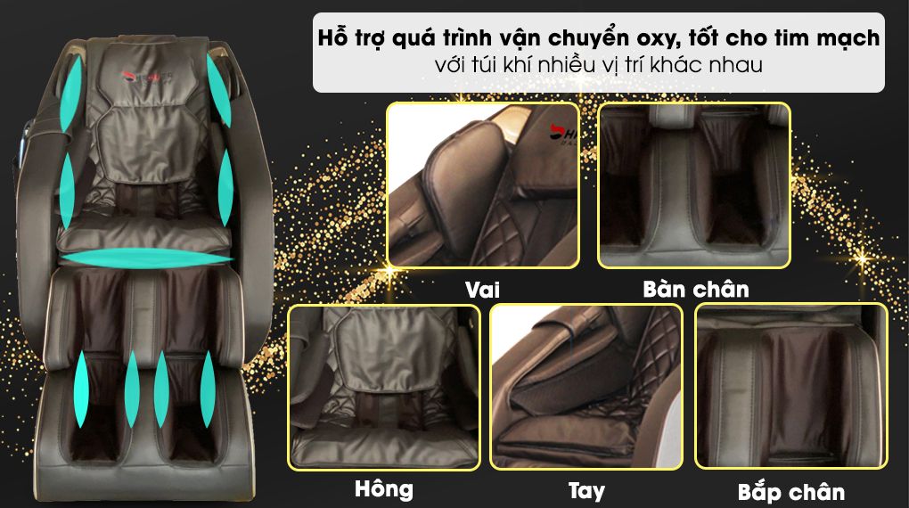 Được trang bị hệ thống 34 túi khí đặt tại các vị trí như vai, hông, tay, đùi, bắp chân,... HMC-669 giúp cải thiện tình trạng lưu thông máu, cung cấp oxy cho cơ tim. Bên cạnh đó, còn được trang bị đa dạng các bài tập cho người dùng lựa chọn tùy theo sở thích cá nhân như thư giãn, kéo dãn, làm dịu,...