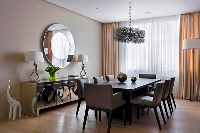 Đặt gương ở bên cạnh bàn ăn mang lại hiệu ứng cách điệu trang trí vô cùng lạ mắt. Khiến không gian phòng ăn trở nên sang trọng và tinh tế hơn bao giờ hết. Ở bên dưới gương, bạn có thể đặt chiếc bàn đựng đồ dùng cá nhân trong gia đình, sắp xếp đồ nội thất như vậy rất hợp lý.