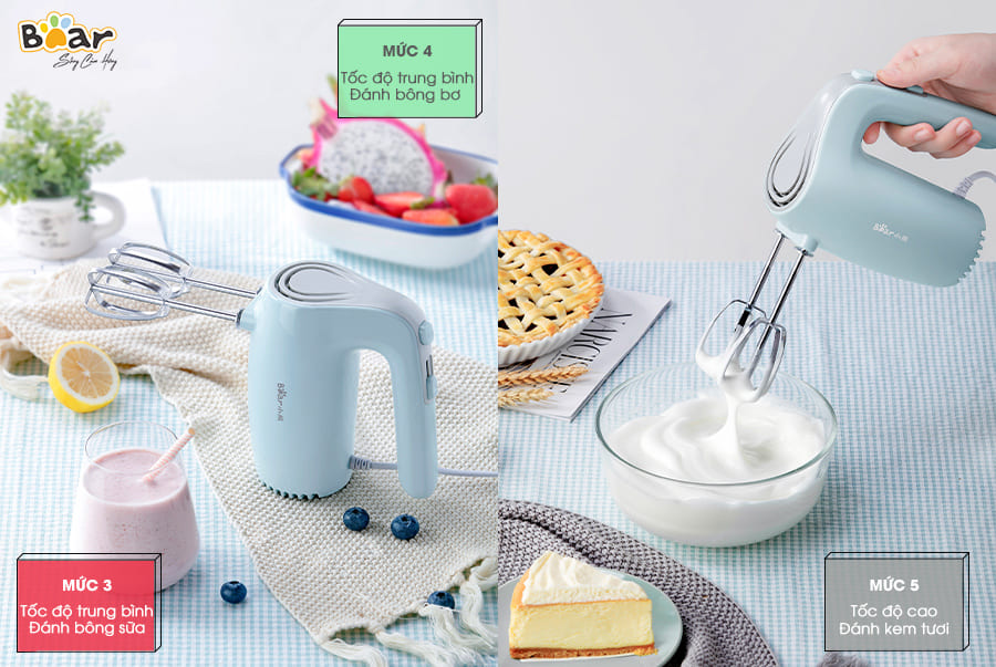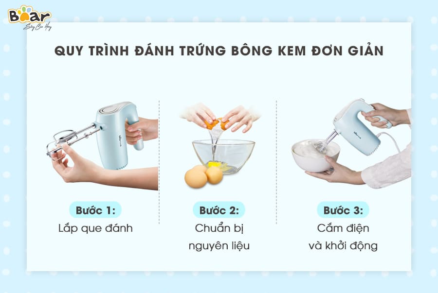 Với thiết kế thông minh và bảng chức năng, tốc độ rõ ràng máy đánh trứng Bear vô cùng dễ sử dụng. Cách dùng đơn giản như sau: