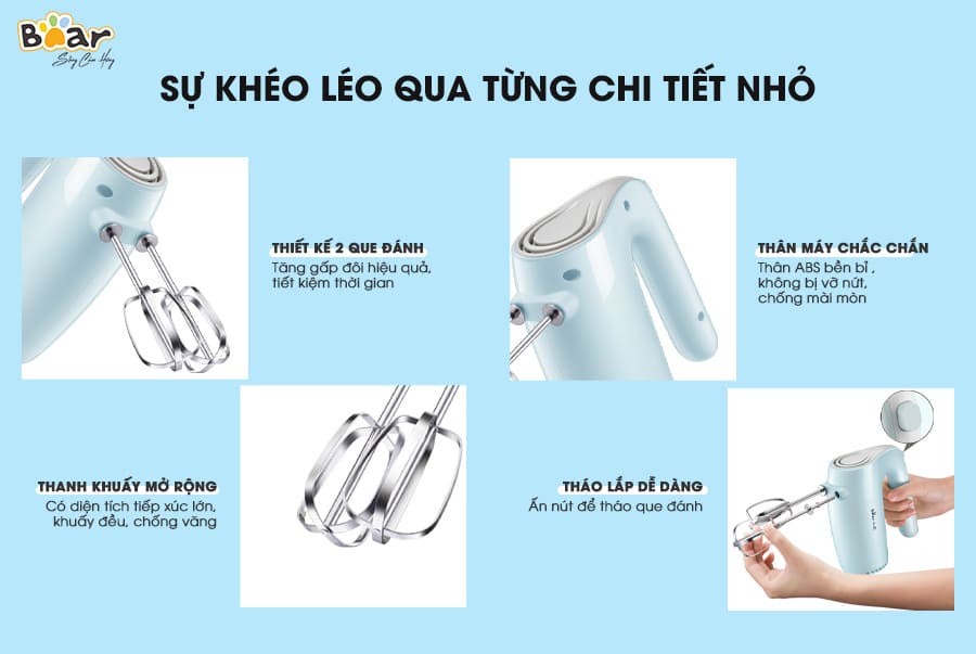 Đặc biệt, trên thây máy còn tích hợp nút chức năng giúp bạn tháo lắp que đánh trứng đơn giản chỉ với một nút ấn tiện lợi. Không tốn thời gian và công sức khi tháo lắp máy đánh trứng nhà Bear, hạn chế rủi ro gây ra hỏng hóc hay thiếu an toàn trong quá trình vận hành máy do tháo lắp không đúng kỹ thuật.