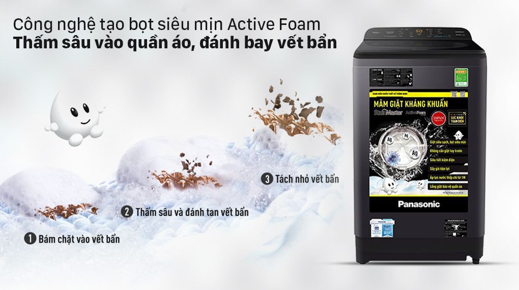 Công nghệ Active Foam đánh tan bột giặt thành hàng triệu bọt khí li ti siêu mịn, thẩm thấu vào sâu bên trong sợi vải và hòa tan các vết bẩn nhanh chóng, giảm thiểu tình trạng cặn bột giặt bám trên quần áo sau khi giặt.