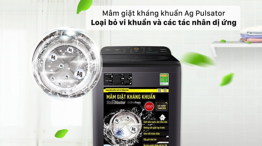Công nghệ giặt chuyên biệt StainMaster Công nghệ xả nước Aqua Spin Rinse Hệ thống ActiveFoam Luồng nước Dancing Water Flow Lồng giặt Sazanami Mâm giặt kháng khuẩn Ag Pulsator |