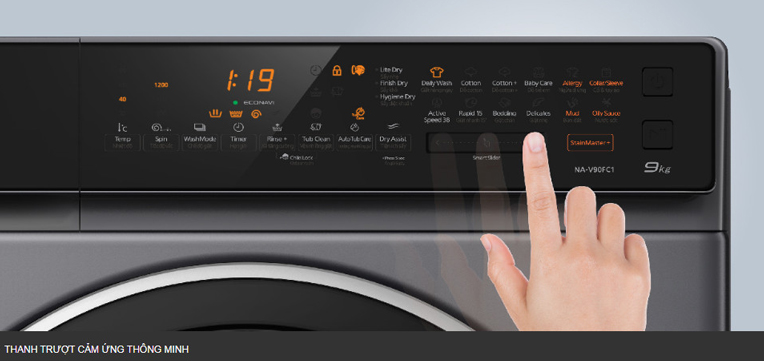 NA-V90FC1LVT trang bị bảng điều khiển được thiết kế cảm ứng trượt/gạt chọn chương trình giặt cùng các nút cảm ứng tùy chọn tự điều chỉnh theo mong muốn sử dụng. Màn hình hiển thị LED rõ ràng giúp người dùng dễ dàng theo dõi và cài đặt chương trình giặt cho máy.