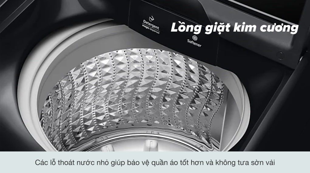 Với thiết kế giống như nhiều tinh thể kim cương xếp cạnh nhau độc đáo, cùng lỗ thoát nước siêu nhỏ giúp quần áo không bị vướng vào lỗ thoát nước, lồng giặt kim cương làm sạch hiệu quả nhưng vẫn nhẹ nhàng chăm sóc từng sợi vải.