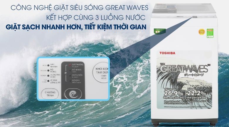 Công nghệ giặt siêu sóng Greatwaves kết hợp hệ thống 3 thác nước cùng tia nước từ mâm giặt 864 lỗ cho ra 3 luồng nước xoay ngang, đập xuống và thổi lên giúp đánh tan các vết bẩn và cặn xà phòng một cách nhanh chóng nhất và giảm thời gian giặt ngâm quá mức, giúp bảo vệ quần áo của bạn.