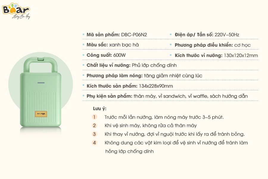 Máy kẹp nướng bánh Bear thường được sử dụng để làm các loại bánh như sandwich nhiều nhân, ép bánh bao kẹp nhân, làm bánh waffle. Và điểm cộng của máy có thể tận dụng để chiên trứng, xúc xích, thịt xông khói...