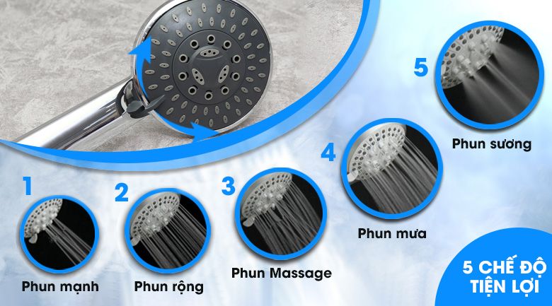 Vòi sen gồm 5 kiểu phun khác nhau: Phun mạnh, phun rộng, phun massage, phun mưa và phun sương. Mang lại những phút giây thư giãn lý tưởng nhất cho người sử dụng khi tắm với nước nóng.