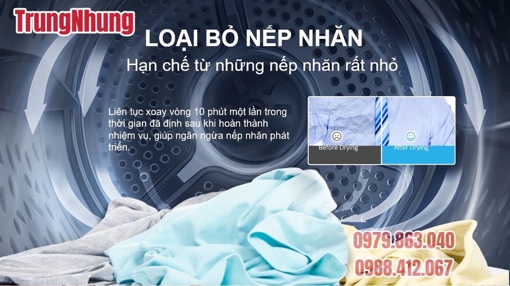 Máy sấy quần áo Casper sẽ liên tục xoay vòng 10 phút một lần trong thời gian được cài đặt sau khi hoàn thành chu trình sấy, từ đó sẽ giúp quần áo không còn bị nhăn trong quá trình sấy thông thường.