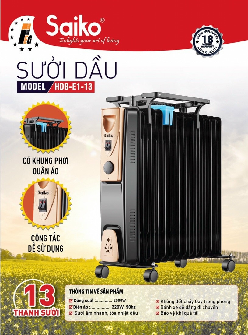 Cũng như các loại máy sưởi dầu khác, máy sưởi dầu Saiko đem lại cảm giác thật ấm áp mà không cần đốt cháy oxy, không làm khô da trong tiết trời đông lạnh mang lại những lợi ích vượt trội hơn hẳn các dòng đèn sưởi, máy sưởi halogen trên thị trường. Máy sưởi dầu Saiko là một sản phẩm gia dụng hiện đại sử dụng công nghệ sưởi ấm bằng cách làm nóng dầu nhiên liệu có trong các thanh sưởi rồi lan tỏa nhiệt đều khắp căn phòng, luồng khí nóng được đối lưu nên mang lại cảm giác ấm áp dễ chịu, dầu vì thế cũng không bao giờ phải thay, sử dụng bền bỉ. Chính vì thế máy sưởi dầu Saiko 13 thanh được các bà mẹ ưa chuộng bởi khả năng sưởi ấm diệu kỳ, lại an toàn khắc phục được những rủi ro, tai nạn do dùng sưởi thông thường.