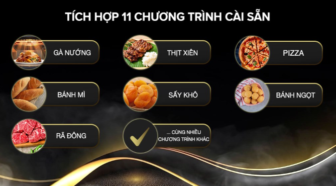 - Sản phẩm lò chiên không dầu này có 11 chương trình nấu cài đặt sẵn, bao gồm: khoai chiên, cánh gà, cá, gà nướng, pizza, thịt xiên, rã đông, nướng, bánh ngọt, bánh mì, sấy khô.
