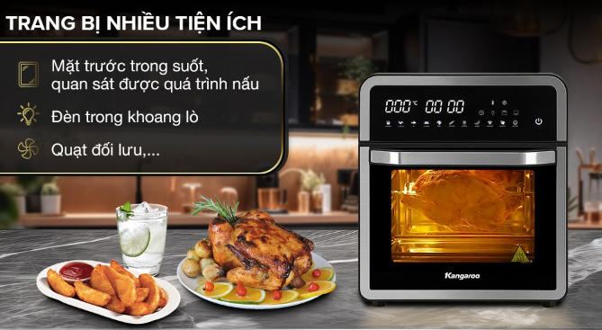 - Lò chiên không dầu Kangaroo KG15AF1A 15 lít thiết kế dạng lò nướng kết hợp nồi chiên không dầu, dung tích lớn 15 lít chiên nướng thoải mái, nhiều chế độ nấu ăn cài đặt sẵn,... hỗ trợ nấu nướng tiện lợi và nhanh chóng.