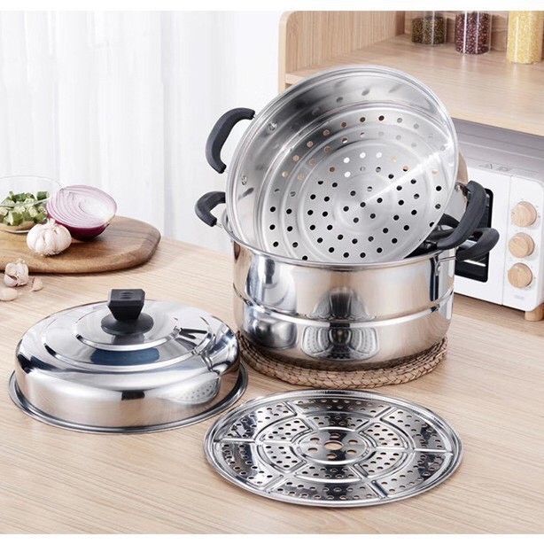 🔖 Nồi Hấp inox 3 Tầng Cỡ Lớn-Bộ nồi hấp inox Steamer Size 28cm Đa Năng Cao Cấp Dùng Cho Mọi Loại Bếp 🔖