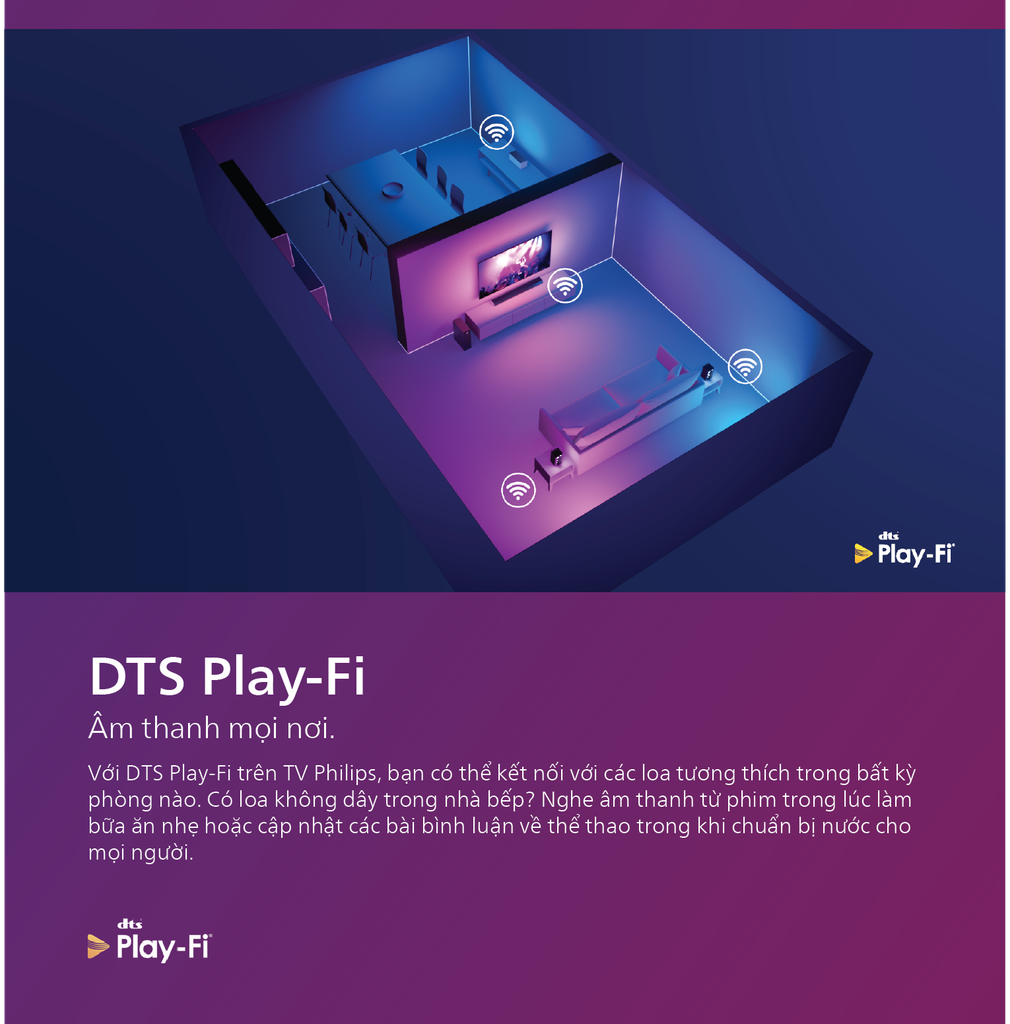 Với DTS Play-Fi trên TV Philips, bạn có thể kết nối với các loa tương thích. Loa không dây trong nhà bếp? Nghe âm thanh của bộ phim khi bạn đang ăn vặt, hoặc theo dõi một bài bình luận thể thao trong khi bạn chuẩn bị đồ uống cho mọi người.