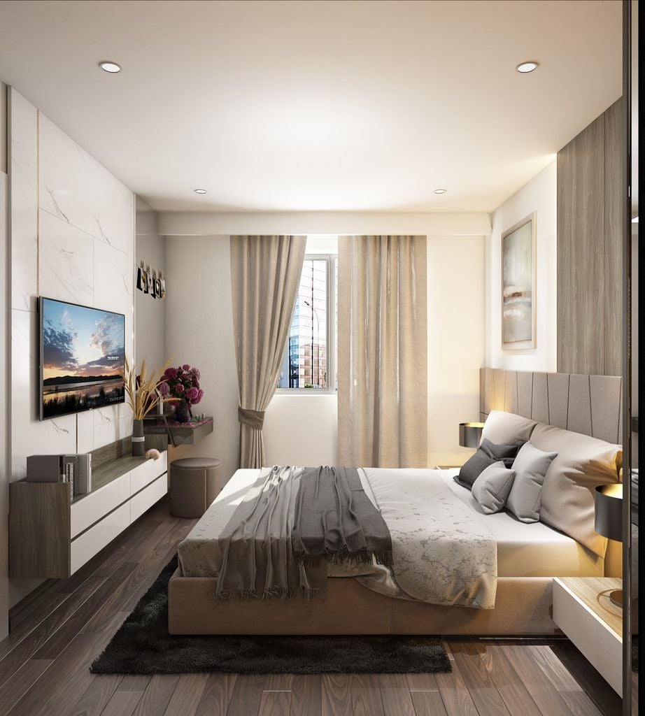 Đầu giường ốp gỗ kết hợp với kiểu giường gỗ bọc nệm, sàn nhà màu gỗ tối và hệ thống rèm cửa màu nâu cà phê sữa, là sự kết hợp thông minh trong việc ăn gian diện tích căn phòng. Vật liệu gỗ chiếm chủ đạo, với kiểu dáng hiện đại và tối ưu diện tích sàn, phòng ngủ trở nên thoải mái và rộng mở hơn nhiều.