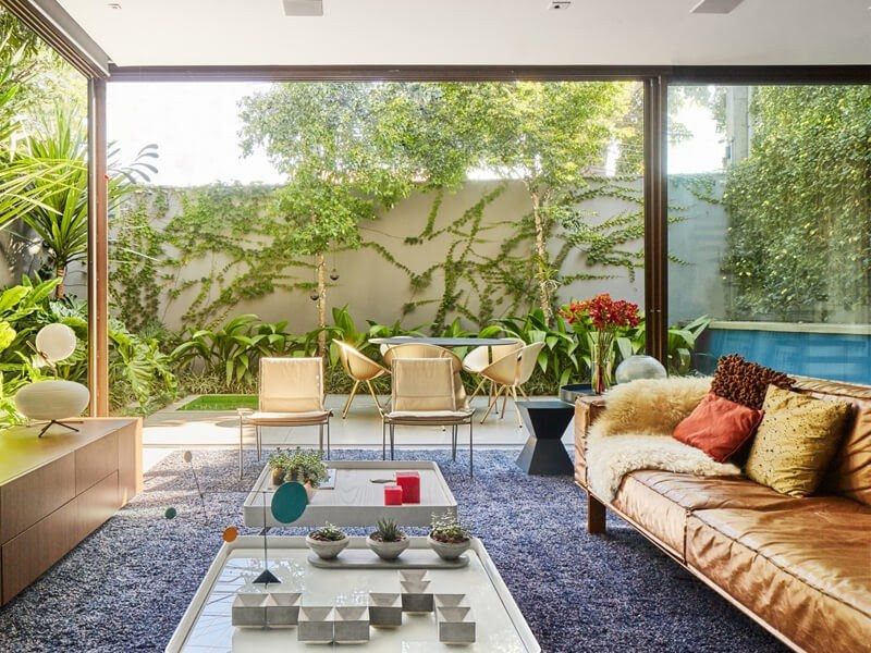 Do đó, phòng khách được trang trí khá nhiều với gương, kính trong suốt thay thế bức tường để tăng cường ánh sáng tự nhiên. Qua đó, tạo sự thoải mái, gần gũi, hài hòa với thiên nhiên cho các vị khách ghé thăm.