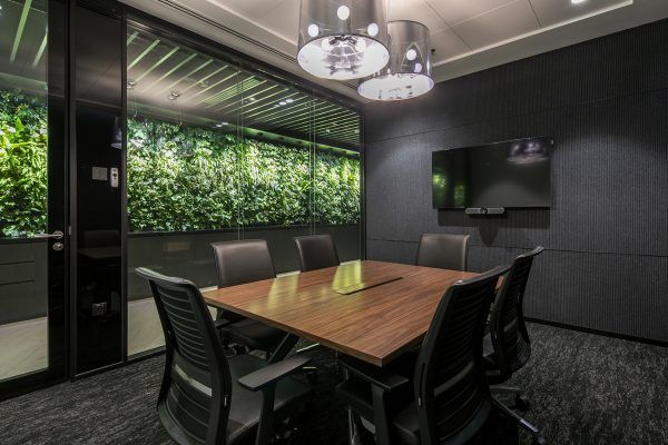 Đây là phòng họp của công ty được thiết kế tách biệt với không gian bên ngoài qua hệ thống cửa kính và tường bao quanh. Cây xanh được trồng trong chậu đặt sát cửa kính, vừa giúp thanh lọc không khí lại che được ánh nắng. Không gian làm việc thoải mái, riêng tư và không ảnh hưởng đến không gian xung quanh.