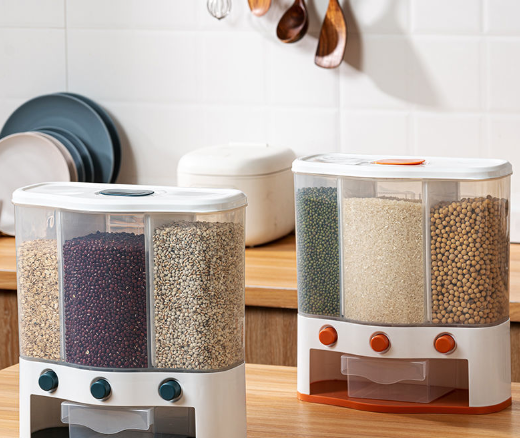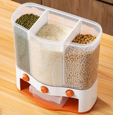 Thùng gạo 3 ngăn có sức chứa tổng 6 lít, bộ sản phẩm gồm 2 tấm khe tạo ngăn có thể tháo lắp tùy ý người sử dụng, nút bấm chảy gạo & ngũ cốc xuống khay ở cả 3 ngăn, 2 bảng keo sillicon vô cùng chắc chắn, có hộc đựng nguyên liệu khử mùi và chống mối mọt. Là sản phẩm thông minh không thể thiếu trong căn bếp gia đình.
