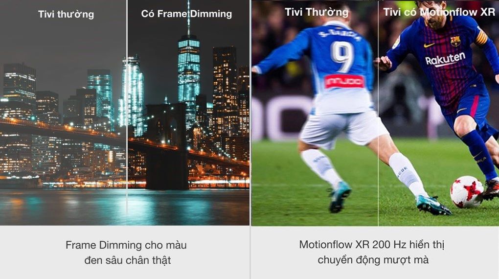 HDR10 Auto Mode Dolby Vision HLG Tăng cường màu sắc Triluminos Pro Bộ xử lý X1 4K HDR Chuyển động mượt Motionflow XR 200 Kiểm soát đèn nền Direct LED Frame Dimming Nâng cấp hình ảnh 4K X-Reality PRO |