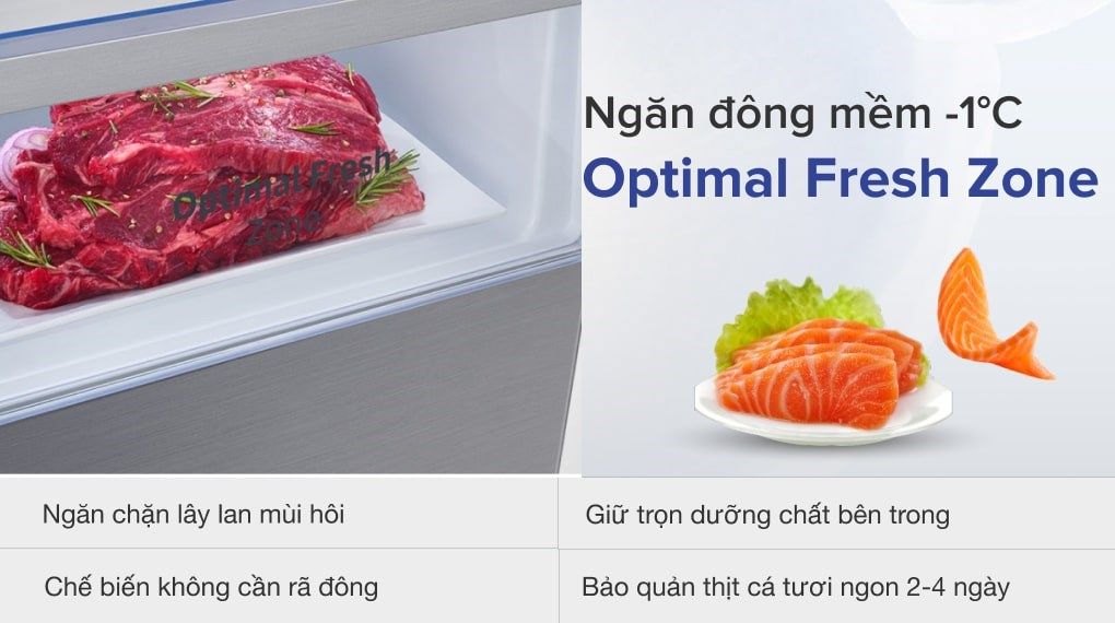 Được hãng trang bị ngăn đông mềm Optimal Fresh Zone -1 độ C, có khả năng bảo quản thịt cá trong ngày mà vẫn giữ được độ tươi ngon và hương vị, đồng thời không cần phải rã đông thực phẩm trước khi chế biến so với ngăn đông thông thường.