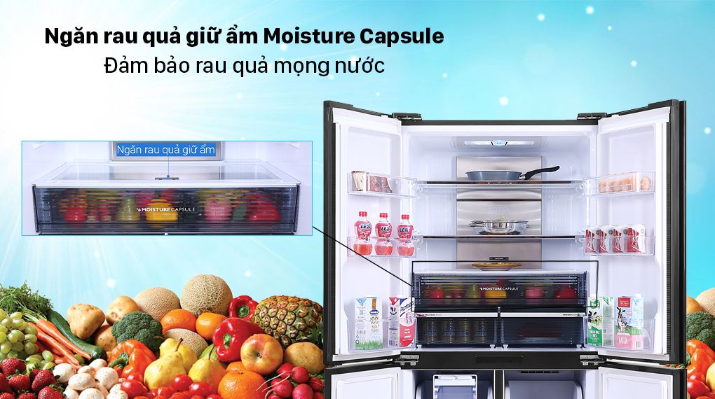 Nhờ ngăn rau quả giữ ẩm, mang đến độ ẩm đầy đủ và phù hợp với thực phẩm có bên trong. Người dùng có thể bảo quản trái cây, rau củ được tươi ngon, mong nước trong suốt quá trình bảo quản.