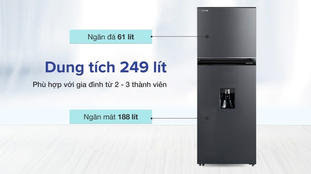Với dung tích đến 249 lít gồm ngăn đá 61 lít và ngăn lạnh 188 lít, cùng tích hợp kính chịu lực các ngăn, giúp bạn thoải mái trữ thực phẩm thật tiện lợi. Đồng thời dung tích này hoàn toàn phù hợp cho gia đình có từ 2-3 thành viên.