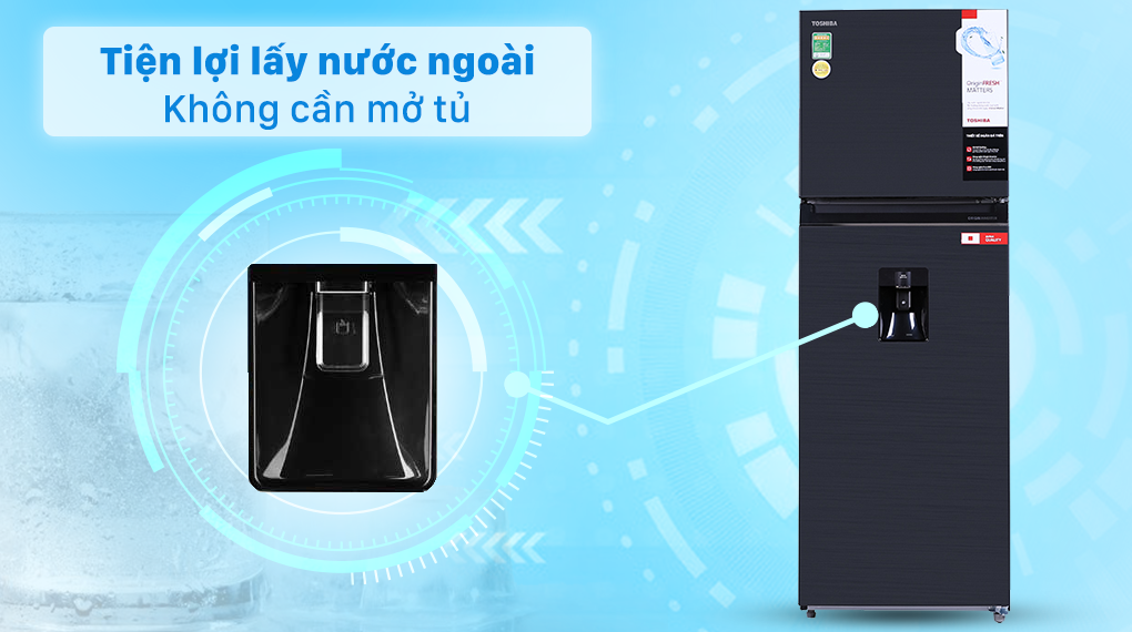 Tủ lạnh Toshiba GR-RT435WE-PMV(06)-MG giúp bạn thưởng thức ngay cốc nước lạnh mà không cần phải mở cửa tủ nhờ ngăn lấy nước được thiết kế bên ngoài tiện lợi. Hơn nữa, bình chứa nước được đặt bên trong tủ (sau cánh cửa) được làm từ chất liệu nhựa an toàn HIPS đạt tiêu chuẩn châu Âu.