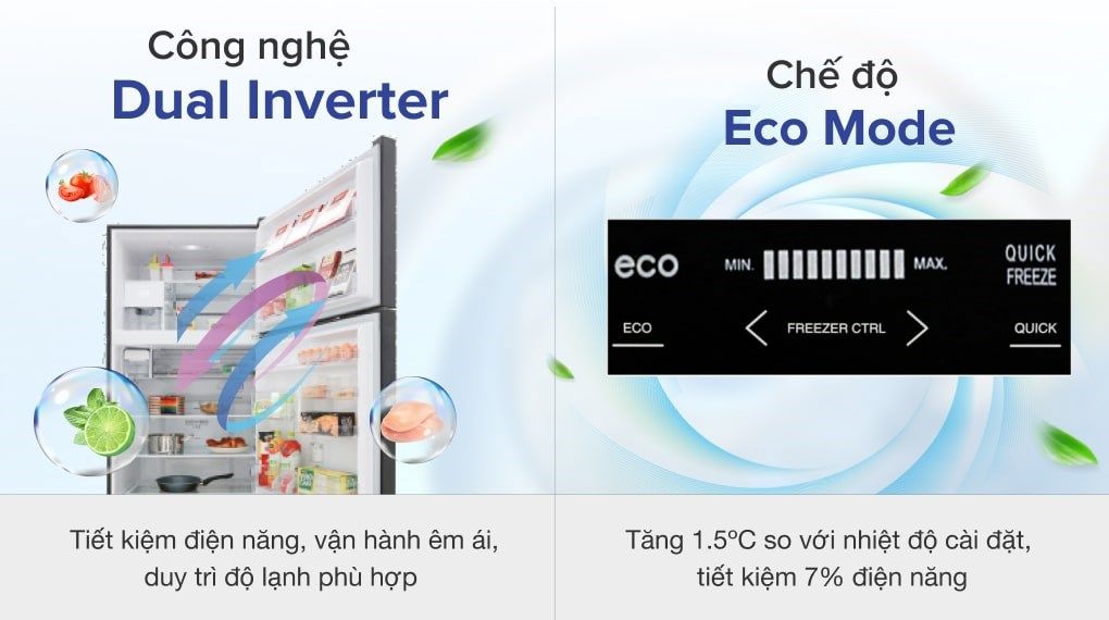 Công nghệ Dual Inverter sẽ giúp cho tủ lạnh luôn duy trì hiệu suất làm việc ổn định, tiết kiệm điện 45% so với tủ lạnh thường, vận hành êm ái, không gây ra sự ồn ào. Kết hợp sử dụng với loại ga R600a vô cùng thân thiện với môi trường và an toàn với sức khỏe gia đình bạn.